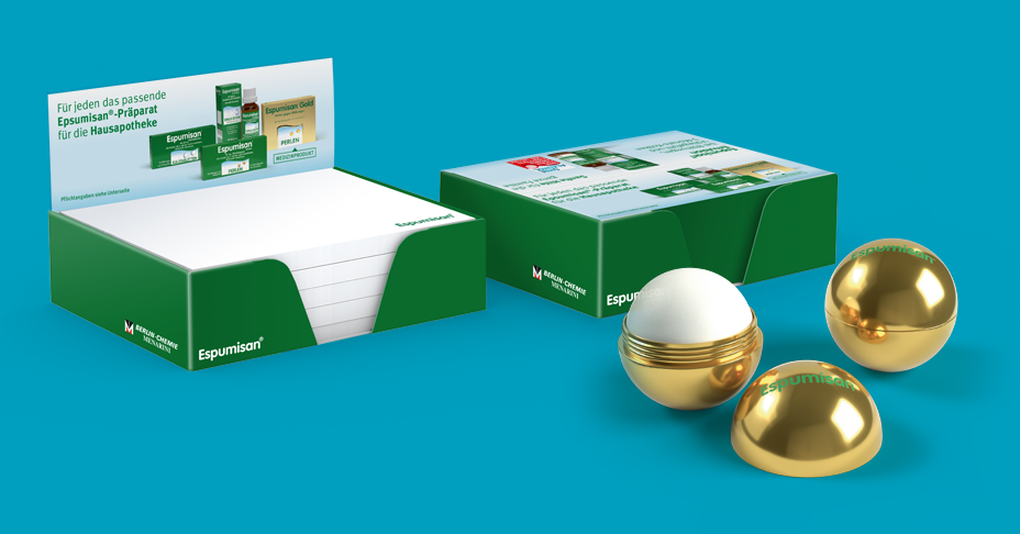 Bei der Bestellung ab 30 OP Espumisan® sortiert erhalten Sie kostenlos 20 goldene Espumisan®-Lippenbalsame für Ihre Kunden und zusätzlich kostenlos 2 Espumisan®-Haftnotizboxen mit je 5 Haftnotizblöcken zum Aufstellen auf Ihrem HV.